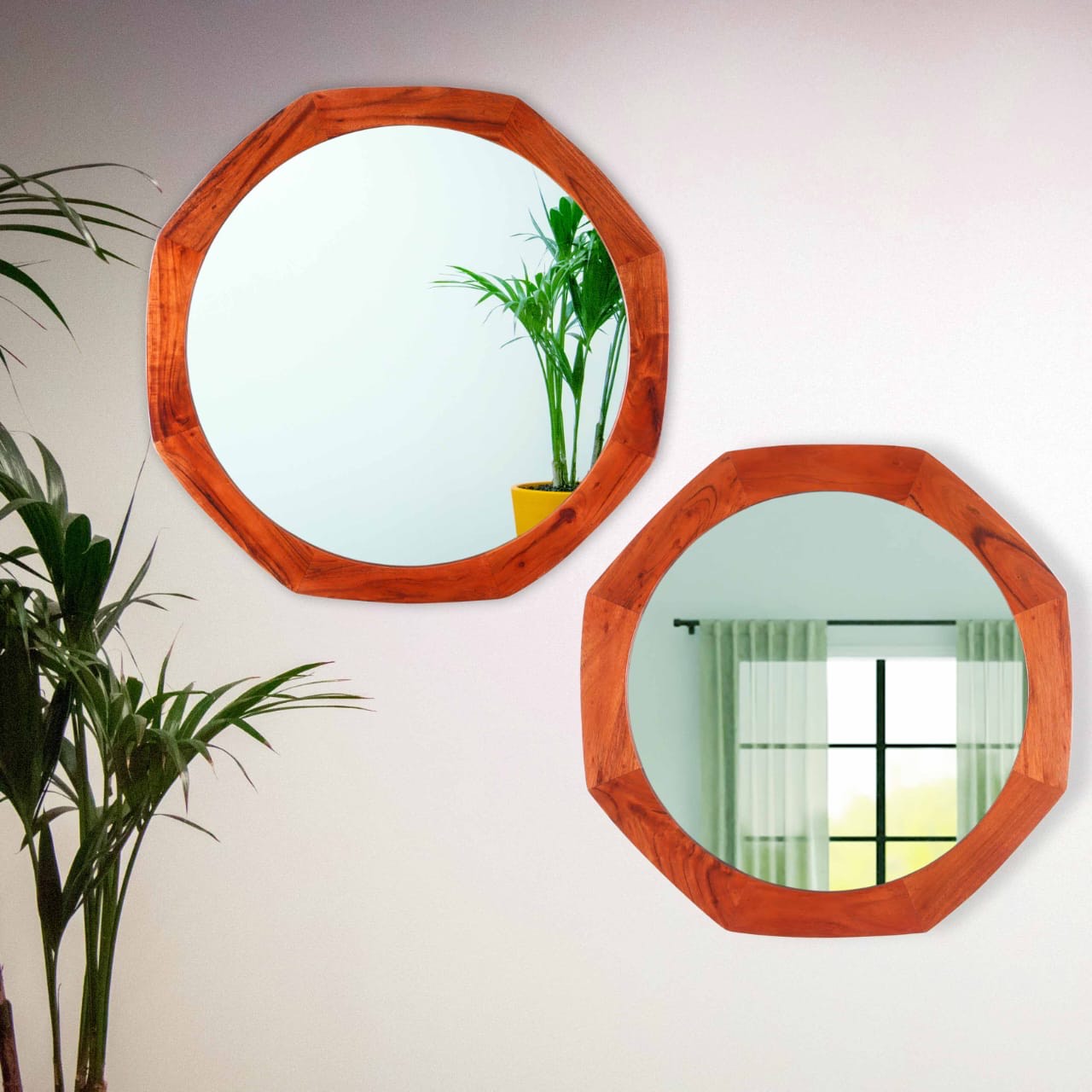 “Twin octagonal mirrors with rich wooden frames reflect timeless charm—capturing glimpses of nature and light in a vintage whisper.”